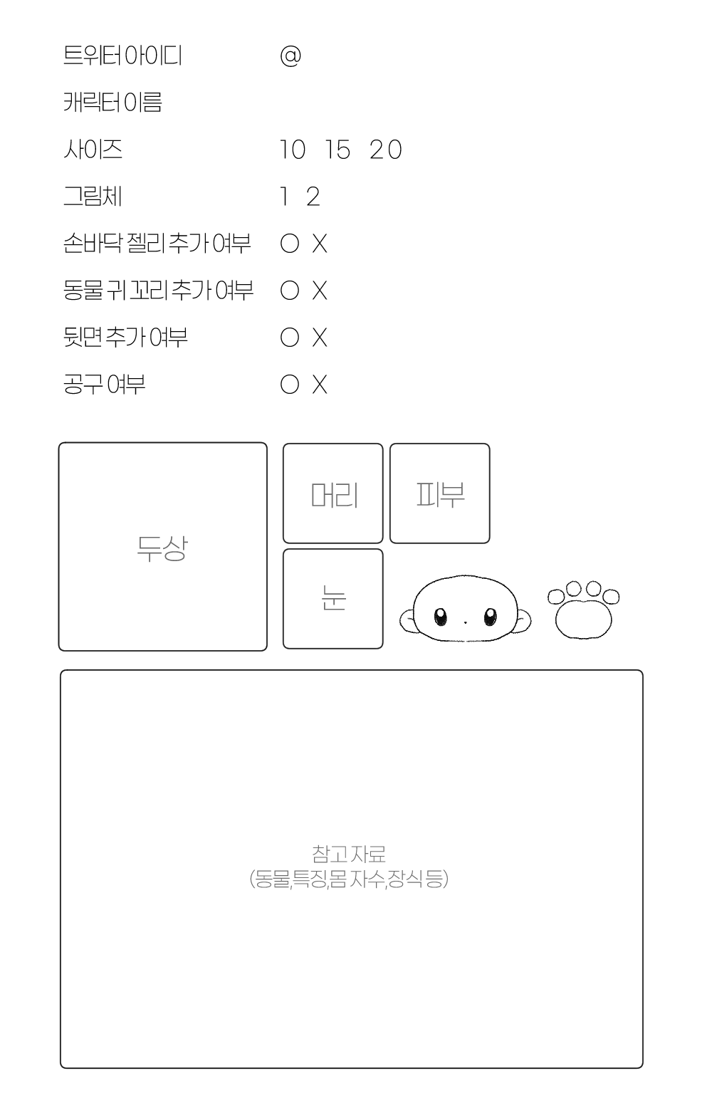 - 제가 글이 많고 복잡한 신청서를 보기 힘들어 합니다.이해 부탁드립니다. 정말 정면 두상 하나만 있어도 도안 귀엽게 작업 가능하니 많은 자료나 설명을 첨부 하지 않으셔도 됩니다. 편하고 간단하게 보내주시길 바랍니다.