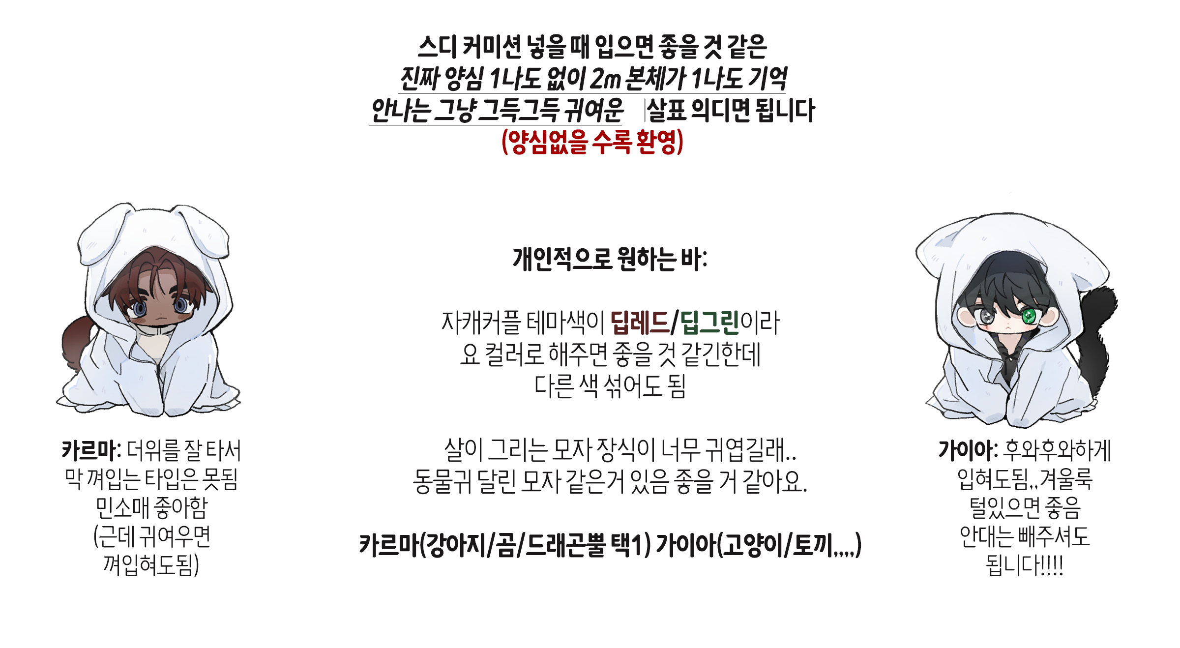 있으면 좋은 것:어떤사이인지,납작한 캐설정,NG요소(치마를 안 입는다던지..어떤 컨셉은 불호라던지...)